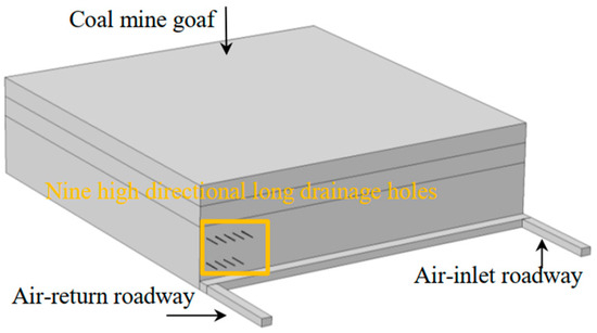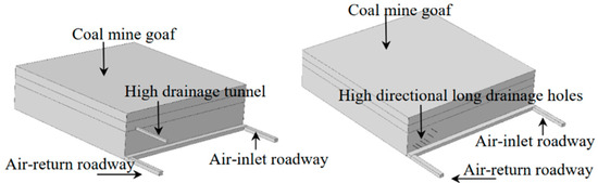 For the adjacent coal seams, the downward invasion of the harmful gases from the old overlying coal mine goaf to the lower mining face occurs frequently [22,23,24]. When a coal mine goaf is formed, the overlying strata can be divided into three zones: the caved zone, fracture zone and bending zone [25,26,27]. In the caved zone, the porosity is high because of the developed fractures caused by the collapsed and crushed rock mass [28]. The volume of the crushed rock mass is bigger than the integrated rock mass because of the void space among the crushed rock mass. Under the support of the collapsed and crushed rock mass in the caved zone, the rock mass above the caved zone deformed with a few fractures. This formed the fracture zone with the broken rock mass [29]. The rock stratum above the fracture zone usually bends with little fractures, forming the bending zone [30]. If the overlying coal seam is in either the caved zone or the fracture zone, the harmful gases will flow downward to the mining face and air-return roadway in the lower coal seam, threatening coal mining of the lower mining face [31,32]. To ensure the safety of coal mining in the lower coal seam, a high-level drainage tunnel is usually adopted to prevent the downward invasion of harmful gases, such as methane, from the overlying coal seams and coal mine goaves [33,34,35,36]. Generally, the high-level drainage tunnel is excavated at the bottom of the fracture zone to drain methane with a higher concentration before it reaches the lower mining face [37,38]. At the bottom of the fracture zone, the broken rock mass and developed fracture provide enough channels for methane migration. Meantime, it avoids the developed airflow at the top of the caved zone where methane concentration is low due to the dilution of air leakage in coal mine goaf. Under this condition, the high-level drainage tunnel can drain the methane of higher concentration without the influence of the airflow in the caved zone. However, a high-level drainage tunnel is time-consuming and uneconomic. In recent years, high-level directional boreholes have been applied to try to take the place of the high-level drainage tunnel [39,40].