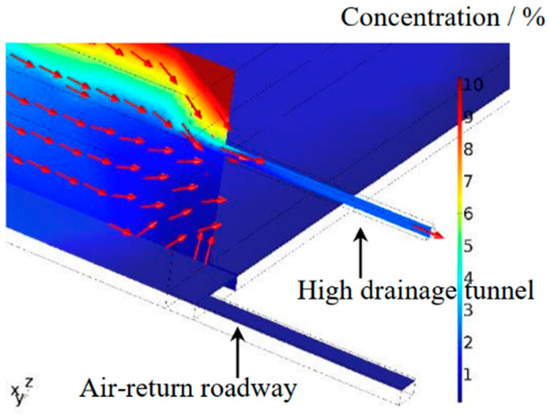 The distribution of carbon dioxide concentration in the coal mine goaf under the drainage effect of a high-level drainage tunnel is shown in Figure 6. The red arrow shows the airflow direction and it is clear that carbon dioxide in the overlying old coal mine goaf flows into the high-level drainage tunnel and the lower mining face. The concentration of carbon dioxide in the overlying coal mine goaf is around 10%. Under the effect of the negative-pressure ventilation in the lower mining face and the developed fractures among the caved rock mass in coal mine goaves, carbon dioxide shows an obvious downward movement. The concentration of carbon dioxide gradually decreases from around 10% in the overlying coal mine goaf to around 1% in the lower coal mine goaf. During the downward movement of carbon dioxide, the high-level drainage tunnel sucks much carbon dioxide for its negative drainage effect. This prevents much carbon dioxide from flowing downward, though some escapes into the lower coal mine goaf. When carbon dioxide flows into the mining face and upper corner of the mining face from the coal mine goaf, the fresh airflow further decreases its concentration by dilution effect. The carbon dioxide concentration is around 0.2% at the upper corner of the lower mining face. Under the drainage effect of the high-level drainage tunnel, some carbon dioxide is sucked into this tunnel and cannot migrate to the lower mining face. When the airflow is stable in this high-level drainage tunnel, the carbon dioxide concentration is around 1.8%.