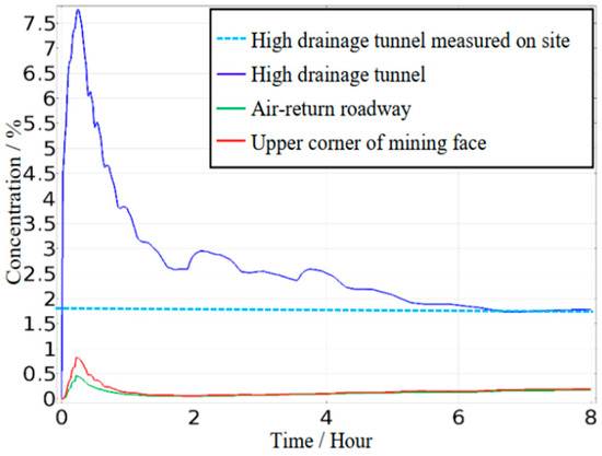 The concentration distribution of carbon dioxide at the representative location is shown in Figure 7. According to Figure 7, the concentration of carbon dioxide in the high-level drainage tunnel is around 7.5% when the high-level drainage tunnel starts to work. The final stable concentration of carbon dioxide in the high-level drainage tunnel is around 1.8% after eight hours, which is consistent with the on-site measurement. The concentration of carbon dioxide along the mining face is shown in Figure 8. It can be seen that, in the mining face, the carbon dioxide concentration is between 0.02–0.03% at the location that is around 40 m away from the air-inlet roadway side. When the location moves to around 70 m away from the air-inlet roadway side, the carbon dioxide concentration is between 0.04–0.09%. It can be obtained that, from the air-inlet side to the air-return side, the carbon dioxide concentration remains at a low level before it approaches the middle of the mining face. Thereafter, the carbon dioxide concentration increases quickly to 0.2% at the upper corner of the mining face. After comparison, it can be seen that the numerical simulation result is basically consistent with the on-site measured result of the lower mining face 8714.