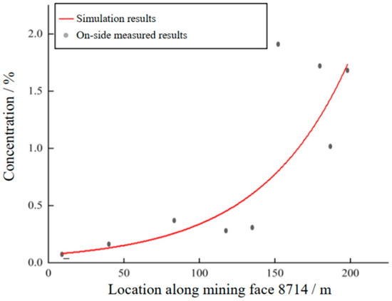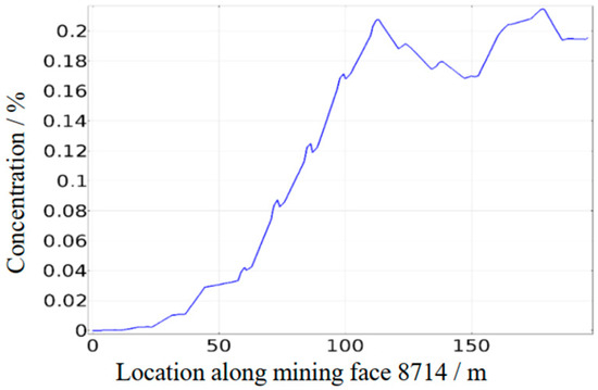 Under the effect of the high-level directional boreholes, the concentration change of carbon dioxide along the mining face is shown in Figure 11. From the air-inlet side to the air-return side of mining face 8714, carbon dioxide concentration is below 0.5% before the middle of the mining face. Then, it increases quickly to around 2% at the air-return side, causing oxygen-poor air quality in the second half of the mining face. According to Figure 11, the numerical simulation is consistent with the on-site measurement results.