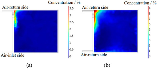 Figure 9. Distribution of carbon dioxide concentration in a coal mine goaf under the effect of high-level directional boreholes. (a) Section one meter above the coal seam roof; (b) section 24 meters above the coal seam roof.