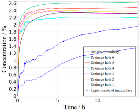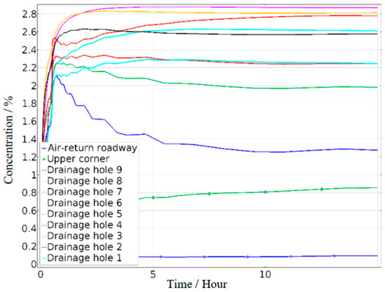 The changes in carbon dioxide concentration in the high-level directional boreholes, air-return roadway and the upper corner of mining face 8714 are shown in Figure 10. Under the effect of the high-level directional boreholes, the concentration of carbon dioxide in the air-return roadway and upper corner of the mining face gradually increases to a stable level. The concentration of carbon dioxide in the air-return roadway approximates 1.4% with a small increase rate, while it is around 2% with a small increase rate at the upper corner of mining face 8714. The concentration of carbon dioxide in the drainage holes varies between 2.2% to 2.6%, and the average concentration of carbon dioxide is around 2.4%. The concentration of carbon dioxide measured on-site is listed in Table 6. The concentration of carbon dioxide at the upper corner of the mining face is between 1.5% to 2.3%, and it is between 1.2% to 1.8% in the air-return roadway, while it is between 1.4% and 2.6% in the outflow of the extraction pumps. After the comparison between the numerical simulation results and on-site measured results in Table 6, it can be obtained that, at the stable stage, the numerical simulation result is basically consistent with the on-site measured results.