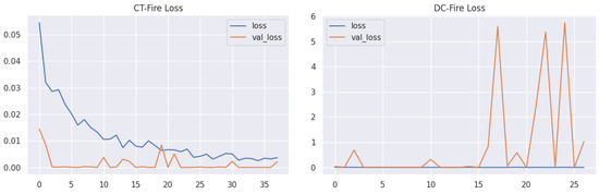 Figure 5 shows the learning and validation loss of the DC-Fire and CT-Fire models. We can see that both models improve rapidly during the first learning epochs, with both training and validation losses rapidly decreasing and converging. While the DC-Fire validation loss shows some variation, the best model was saved before the variation occurred, thanks to early stopping methods. It was then tested on unseen data and achieved high performance with well-classified images, as shown in Table 3, indicating that it learned well and generalized with no overfitting, similar to the CT-Fire model.