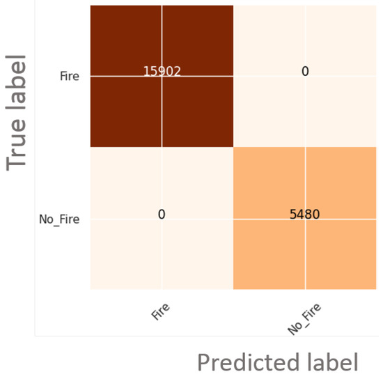 Confusion matrix of both DC-Fire and CT-Fire using both IR and RGB images (both models obtained the same results).