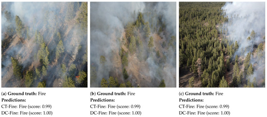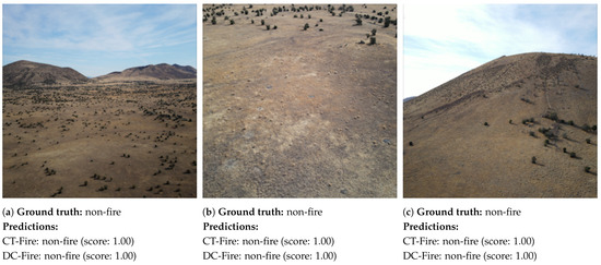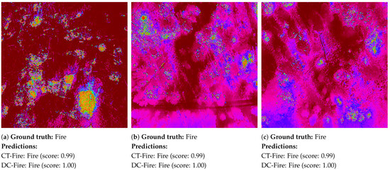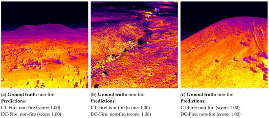 Similar to the numerical results presented in Table 3, the proposed CT-Fire and DC-Fire correctly predict and identify the presence of wildfires using RGB images (as shown in Figure 7 and Figure 8) and infrared images (see Figure 9 and Figure 10) of both fire and non-fire situations. For example, they performed well in classifying IR and RGB aerial fire images with high confidence scores of 0.99 for CT-Fire and 1 for DC-Fire, as depicted in Figure 7c and Figure 9c.