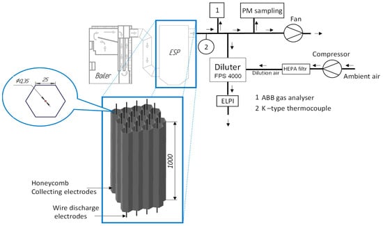 To control PM and NOx from the boiler, the special honeycomb ESP was designed, in which collecting electrodes were formed by 20 hexagons with a side length of 25 mm; wire discharge electrodes of stainless steel wires (0.35 mm diameter) were installed along the axis of each hexagon cell. The electrodes had an active length of 1000 mm. The total collecting area of the designed ESP (A) was over 3 m2. ESP was operated with negative/positive polarity. The ESP was powered by an XP Glassman high-voltage power supply, model PS/030R040-22, capable of delivering a maximum output voltage of 30 kV and a current of 40 mA. The current measurements of the HV unit have an accuracy of better than 1%, while the voltage measurements deviate by less than 2% of the rated output voltage, with recovery to within 0.1% in 1 ms. The measurements were undertaken when ESP was powered in five modes with current values of 1, 5, 10, 20, 30, and 40 mA.
