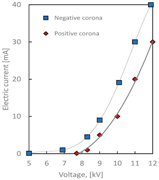The current–voltage characteristic of the studied ESP is presented in Figure 2 for both polarities.