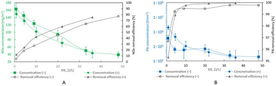NOx removal efficiency can be observed as a sublinear function of SIE for negative corona in the range from 5% to 77% and for positive corona in the range from 11 to 76%. Demonstrated ESP efficiency can be supported by other researchers, including [], who observed a similar reduction in soot and NOx concentrations by NTP treating gases exhausted from a diesel engine, and [], who investigated NOx removal from coal combustion gases. More information on NOx removal in NTP generated by different types of discharges can be found in a comprehensive review [].