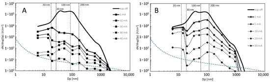 Figure 4 illustrates the changes in particle size distribution as a function of ESP energisation for both negative and positive corona discharges along with the detection limit of the ELPI defined by MarjamäkiKeskinen, Chen, and Pui [], which is given as a blue dotted line. The initial particle size distribution, measured without the ESP-off operation regime, was typical to small-scale combustion, demonstrating unimodal distribution with a peak of approximately 1.5 × 107 #/cm3 at a particle diameter of 70 nm.