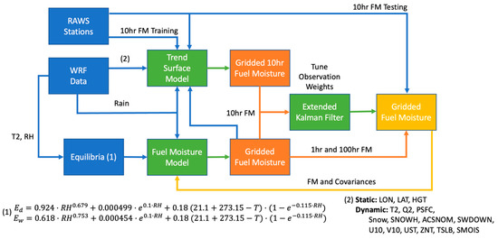 A fuel moisture data assimilation (FMDA) system that integrates 10-h fuel moisture observations from RAWS into a simplified fuel moisture model was proposed [26], providing promising results. The FMDA system consists of a Trend Surface Model interpolating the observations into the prediction grid and a time-lag fuel moisture model, advancing the dead fuel moisture state depending on weather conditions. Then, an Extended Kalman Filter (EKF) is used to blend model results and observations. The system has been adopted operationally within the fire forecasting system WRFx [27]. Since 2021, this system has been generating hourly DFMC estimates using weather data from the Real-Time Mesoscale Analysis (RTMA) product [28] for the fire danger assessment and initialization of the fuel moisture fields in the coupled atmosphere–fire model WRF-SFIRE [29] used to forecast wildfire behavior in the WRFx system. The gridded fuel moisture estimates, including covariates and RAWS observations, can be found on the dedicated web portal [30].