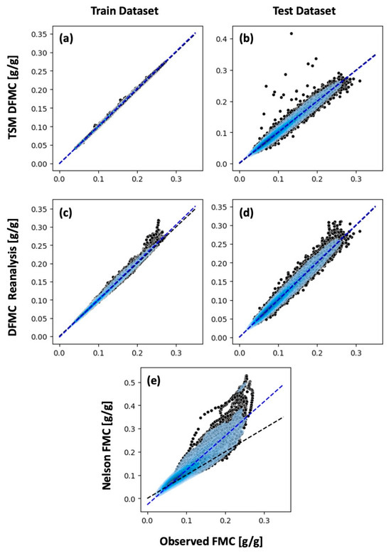 Figure 2. Scatter plots of observed and estimated fuel moisture (black dots), kernel density estimate (KDE) (blue shading), linear fit (in a least-squares sense) to the data points (blue dashed line) and perfect fit (black dashed line) for the year 2018 comparing observed fuel moisture to (a) TSM with the training set, (b) TSM with the testing set, (c) DFMC reanalysis product with the train set, (d) DFMC reanalysis product with the test set, and (e) Nelson model with all the data.