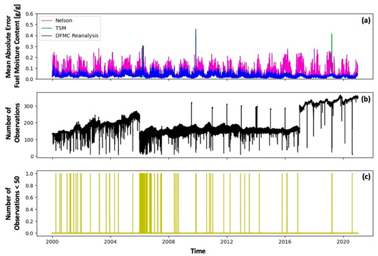 Figure 3. Time series of (a) the error in the fuel moisture estimates from the Nelson model (purple line), TSM (green line), and the dead fuel moisture content (DFMC) reanalysis product (blue line), (b) the number of available observations for the state of California, and (c) a Boolean variable that is equal to 1 for the periods with a number of observations fewer than 50.
