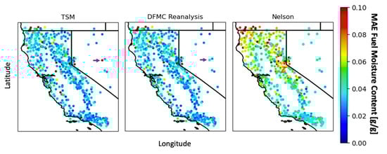 To assess the spatial pattern in the error in the DFMC estimates, the discrepancies between the estimated and measured 10 h dead fuel moisture have been estimated for the locations of RAWS reporting the DFMC observations. Figure 4 shows a spatial distribution of the mean absolute error for the entire geographical and temporal extent of the products for the TSM, DFMC reanalysis product, and the Nelson model. The errors observed in the Nelson model are significantly higher than in both TSM as well as our DFMC reanalysis. Although the performance of the TSM and DFMC reanalysis is very similar, the DFMC reanalysis did reduce the error at some specific RAWS locations. The station at the plot’s eastern side (pointed by a purple arrow) is a clear example of that. Analyzed locations with larger errors (red dots) primarily consisted of those harboring conflicting stations situated very close together, or stations encountering ongoing technical issues, which highlights the necessity for future improvements in observation quality control.