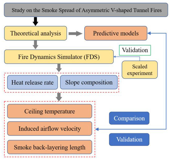 However, few studies have investigated the smoke propagation in V-shaped tunnels. Jiang et al. [34] investigated the impact of fire location on smoke propagation in symmetrical V-shaped tunnels using numerical simulations. They observed that as the distance between the fire source and the gradient change point increases, the smoke recirculation length initially decreases and then slightly increases. However, there are few studies on the smoke flow and dispersion in asymmetrical V-shaped tunnels. In this study, the influence of a V-shaped tunnel structure and HRR on smoke spread will be investigated by numerical simulations, and the prediction model for the back-layering length and longitudinal induced velocity in the small-slope side tunnel will be obtained. The flowchart depicting the methodology employed in the study is illustrated in Figure 1. The research findings might offer valuable insights for developing a smoke control strategy for tunnels with complex vertical sections.