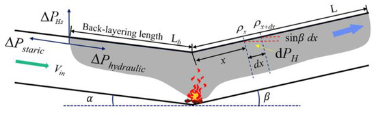 The static pressure of the smoke and the thermal buoyancy due to the height difference jointly drive the smoke to spread upward, while the longitudinal induced ventilation inhibits the upward spread of smoke in the small-slope side tunnel. If the dynamic pressure of the longitudinally induced velocity equals the driving force of the smoke, the equilibrium state is reached. The back-layering length of the smoke in the small-slope side tunnel will stabilize, and this distance is defined as Lb, as shown in Figure 2. Therefore, at the smoke front in the small-slope side tunnel, the relationship is as follows: