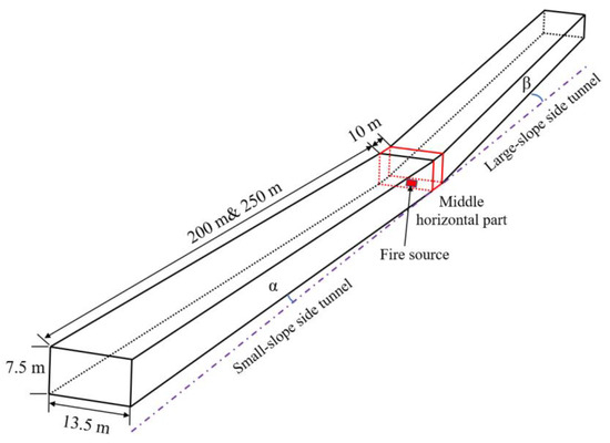 The length and the slope of the asymmetric V-shaped tunnel have a significant influence on the smoke diffusion in tunnel. In this study, two tunnel lengths are selected. The total length of the tunnel is 410 m and 510 m, and the middle horizontal parts is 10 m. The physical tunnel model is shown in Figure 3. The cross-section of the numerical tunnel is 13.5 m (width) × 7.5 m (height), which refers to the cross-section of the real tunnel in Beijing.