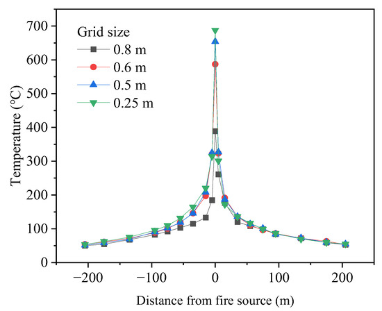 In this study, the minimum HRR is 20 MW. For 20 MW, D* is calculated as 3.26 m, and the grid size δx should fall within the range of 0.20 m to 0.81 m. Comparing the simulation results of four different grid sizes (0.25 m, 0.5 m, 0.6 m, and 0.8 m), the numerical temperature beneath the ceiling under different grid sizes is shown in Figure 4. As can be seen from the figure, the simulation results of the grid size of 0.8 m are lower than those of the other three grid sizes, while the simulation results of the grid size of 0.25 m, 0.5 m, and 0.6 m are very close to each other. To balance computational efficiency with accuracy, the grid size near the fire source is set to 0.25 m, and the rest of the area is 0.5 m.