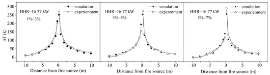 In order to ensure the accuracy of the study on the expansion of asymmetric V-shaped tunnels by numerical simulation, the 1:20 small-size experiment results of three slope forms of 1–3%, 3–5%, and 5–7% were compared with the numerical simulation results of the same small-size ceiling temperature along the way, as shown in Figure 5. The results show that the results of the two research methods are in good agreement, so it can be judged that the reliability of using FDS to simulate the smoke diffusion of asymmetric V-shaped tunnels is high.