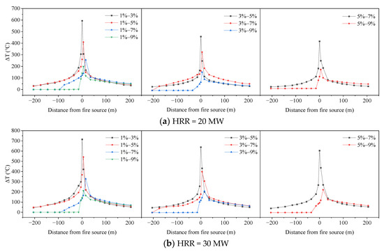 Figure 6 shows the simulation results of the longitudinal temperature distribution beneath the ceiling under different slope combinations. The longitudinal induced flow of the tunnel on the small-slope side inhibits the upward diffusion of smoke. When the slope of the tunnel on the small-slope side is constant, the temperature under the ceiling of the tunnel on the small-slope side decreases with the increase in the slope difference on both sides of the V-shaped tunnel, and the position closer to the ambient temperature on the small slope side tunnel is nearer to the fire source. When the slope of the large-slope side tunnel is 9%, there is almost no high temperature smoke in the small-slope side tunnel. With the increase in the slope difference between the two side tunnels, the temperature decay on the large-slope side slows down. When the slope difference is 2%, the influence of the slope of the small-slope side tunnel on the longitudinal temperature distribution is small. When the slope difference exceeds 4%, the difference in the temperature distribution on both sides increases with the increase in the slope of the small slope side, and the greater the length of the temperature close to the ambient temperature.