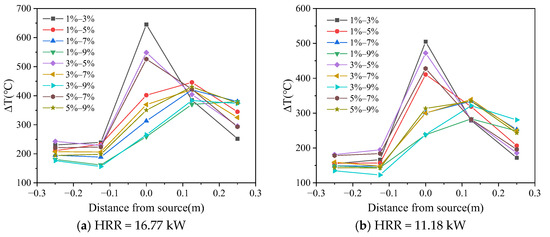 The simulation results indicate that the maximum ceiling temperature decreases with the increase in the slope of the large-slope side tunnel, and the location of the maximum temperature shifts to the large-slope side. Figure 7 illustrates the ceiling temperature near the fire source from the small-scale experiments. When the slope difference between the two side tunnels is about 2%, the location of the maximum ceiling temperature occurs directly above the fire source, and it decreases with the increase in the slope of the small-slope side tunnel. When the slope difference is greater than 2%, the position of the maximum ceiling temperature is closer to the large-slope side and is about 0.125 m from the fire source. The maximum ceiling temperature decreases with the increase in the slope of the large-slope side tunnel.