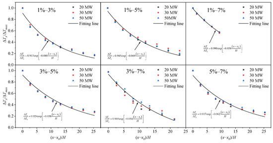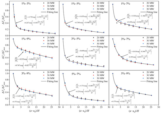 The dimensionless temperature rise beneath the ceiling along the longitudinal direction and the dimensionless distance from a reference point of the asymmetric V-shaped tunnel are plotted. According to Equation (12), the temperature rise within the smoke back-layering length segment in the small-slope side tunnel was fitted. The results, shown in Figure 9, indicate that the R2 values are all greater than 0.95. However, the fitting results for the temperature rise in the large-slope side of the tunnel using Equation (12) are poor. In previous studies, double exponential decay functions have been employed by scholars to characterize the longitudinal ceiling temperature rise decay in tunnel fires [38,39] In this study, Equation (29) was used to model the ceiling temperature rise in the large-slope side tunnel. The fitting results are shown in Figure 10, and the temperature decay coefficients are listed in Table 2. The results indicate a good fit.