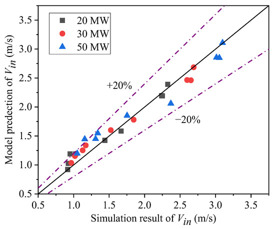 Figure 11 shows the comparisons of numerical induced airflow velocities with those predicted by Equation (30), and it can be found that the simulation results are in good agreement with those calculated by the empirical equation.