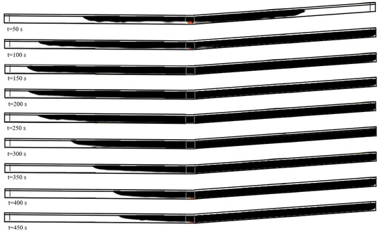 In asymmetrical V-shaped tunnels, due to the different buoyancy forces of the smoke, there is mutual competition between the small-slope side tunnel and the large-slope side tunnel, and this competition changes with time. Figure 12 shows the variation of smoke propagation with time when the tunnel slope structure is 1–7%. At the initial stage of the fire, the smoke spreads rapidly to the tunnels on both sides. After about 100 s, the smoke back-layering length reaches the maximum in the small-slope side tunnel and then gradually decreases to a stable value after 400 s.