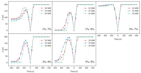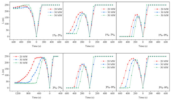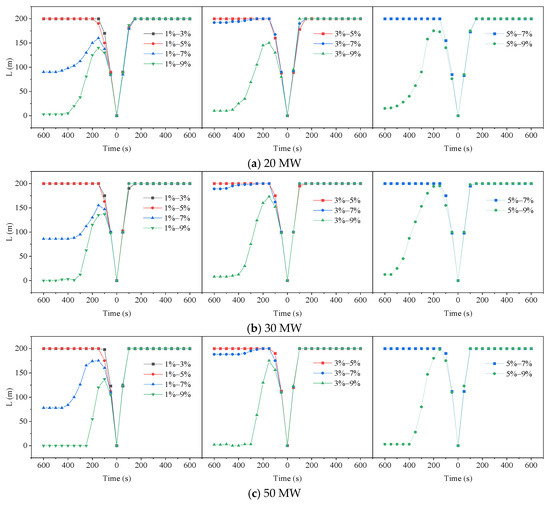 When the length of a side tunnel is 250 m and the total length of the tunnel is 510 m, the smoke spreading distance changes with time, as shown in Figure 15. The results show that the smoke backflow occurs in tunnels with slope forms of 1–5%, 1–7%, 1–9%, 3–7%, 3–9%, and 5–9%. Comparing the smoke diffusion distance of two tunnel lengths with the same slopes, the increase in tunnel length can significantly reduce the smoke diffusion distance in the small-slope side tunnel. The increase in the length of the large-slope side tunnel can significantly strengthen the stack effect and increase the induced airflow velocity. Similarly, the HRR has almost no effect on the smoke back-layering length.