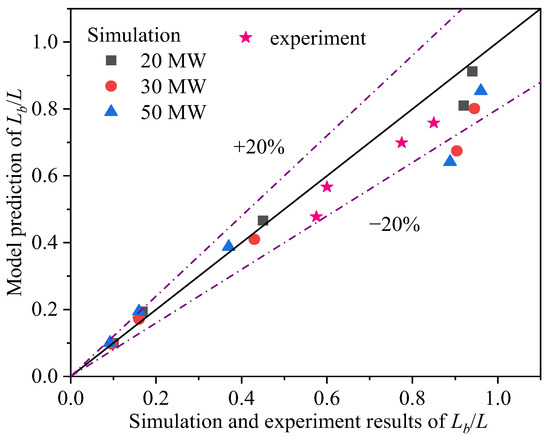 Figure 16 shows the comparisons of simulation and experiment results of the smoke back-layering length with those predicted by Equation (27). It can be seen from the figure that there are some discrepancies between the predicted results by Equation (27) and the numerical results and experimental results when the smoke back-layering length is large and the induced airflow is small. This might be due to the fact that the smoke flow entrainment effect of the small-slope sideways was ignored in the theoretical derivation process. Under this assumption, when the induced airflow velocity on the small-slope side tunnel is low, the model results are usually higher than the simulation results, while the smoke back-layering length shows the opposite trend. However, the error caused by this assumption does not affect the overall accuracy of the results and is still within an acceptable range.