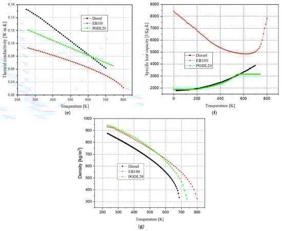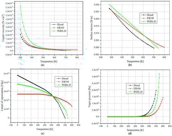 Similarly, Ruan et al. [] investigated methods for evaluating the physical parameters of used cooking oil, focusing on viscosity, density, and surface tension under varying temperatures, by developing a predictive program for biodiesel physical properties, which was validated against empirical measurements. On the other hand, Cheng et al. [] used computational fluid dynamics (CFD) modeling to study the effects of liquid density, vapor pressure, surface tension, viscosity, and vapor diffusivity on fuel pulverization and axial vapor penetration for the following three biofuels: palm oil methyl ester (PME), soybean methyl ester (SME), and coconut methyl ester (CME). Their results indicate that liquid surface tension and vapor pressure are the most sensitive parameters for fuel pulverization.