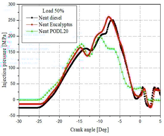 Moreover, Simhadri et al. [] studied the effects of titanium dioxide (TiO2) nanoparticle additives on Mahua Biodiesel B20 blends at different injection pressures. They found a 5.3% higher HRR with B20T50 at 180 bars and improved BTE and fuel consumption at higher pressures. TiO2 also reduced emissions, with notable decreases in smoke opacity and NOx at 240 bars. In a related context, Kunchi et al. [] investigated the impact of adding zinc and manganese nanoparticles (50 ppm and 75 ppm) to Terminalia bellirica biodiesel B20 on diesel engine performance, combustion, and emissions at injection timings of 21° BTDC, 23° BTDC, and 25° BTDC, finding that the nanoparticle dispersion and advanced injection timings significantly enhanced performance and combustion characteristics while reducing emissions.
