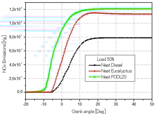 Similarly, Ooi et al. [] examined the impact of adding multiwalled carbon nanotubes (MWCNTs) to a palm-oil biodiesel–diesel blend B20, finding that MWCNTs reduced ignition delay, shortened combustion length, and accelerated combustion phasing by up to 17.6%, 12.9%, and 18.5%, respectively, while enhancing BSFC and BTE by up to 15.7% and 16.3% and reducing CO and HC emissions by up to 34.7% and 16.0%, respectively, but increasing NOx emissions by up to 43.5%, suggesting overall improvements in performance, combustion, and emission characteristics. Li et al. [] conducted a modeling study on blending n-octanol with biodiesel, using a reaction mechanism with 115 species and 489 reactions to explore its impact on combustion quality and emissions in diesel engines. By progressively increasing n-octanol from 0% to 100% in 10% increments, their simulations demonstrated that blending n-octanol with B20 can enhance power output and reduce soot emissions.