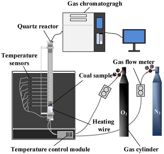 - To master the production patterns of combustible gases during coal oxidation, a high-temperature programmed heating test system for coal spontaneous combustion was established. It mainly consists of a quartz reactor, a programmed heating system, an automatic gas distribution system, a data acquisition system, and a gas chromatograph, which enables the detection of gaseous products during the high-temperature stage of coal spontaneous combustion;