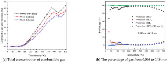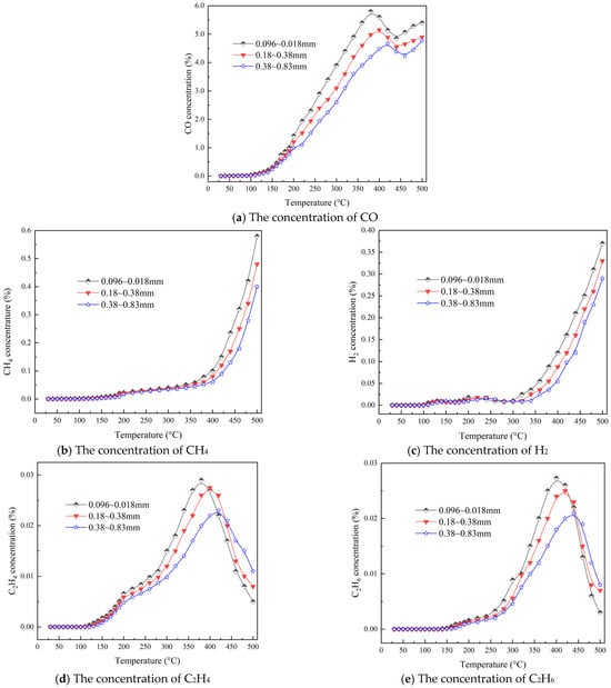 The concentration of combustible gas produced during the heating process with different particle sizes is illustrated in Figure 2. Figure 2a reveals that larger coal particles produce lower concentrations of CO. This phenomenon is attributed to the larger particles having a smaller specific surface area and lower porosity, which results in fewer active sites for coal surface interaction with oxygen, thus reducing the CO concentration during the oxidation process. Furthermore, it is observed that the peak temperature of CO concentration significantly shifts towards higher values with increasing coal particle size. For example, for coal particles sized between 0.096 and 0.18 mm, the peak CO concentration occurs at 400 °C, whereas for particles sized between 0.38 and 0.83 mm, it occurs at 440 °C.