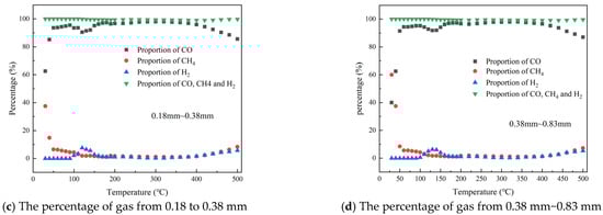 The total quantity of combustible gases produced during the coal oxidation process under various particle size conditions and the proportion of the main combustible gases is illustrated in Figure 3. As shown in Figure 3a, the total amount of combustible gases generated by coal of three different particle sizes begins to rise significantly after reaching 100 °C and continues to increase as the temperature rises. Comparing the production of combustible gases among different particle sizes, it is evident that as the particle size of the coal sample increases, the total volume of combustible gases gradually decreases. It also illustrates that different types of coal exhibit peak values between 350 °C and 450 °C, primarily due to a significant reduction in CO concentration during this phase. Comparing the production of combustible gases at particle sizes of 0.096~0.18 mm, 0.18~0.38 mm, and 0.38~0.83 mm, the peak concentrations are 6.02%, 5.37%, and 4.91%, respectively, indicating a gradual decrease in the peak concentration of combustible gases as coal particle size increases. Figure 3b–d display the percentages of the three primary combustible gases—CO, CH4, and H2—relative to the total combustible gas volume under different particle size conditions. It is observed that the proportional concentration of CO, CH4, and H2 follows a similar trend across varying particle sizes, accounting for over 99% of the combustible gases in the temperature range of 30 to 500 °C. A comparison of the production patterns of these three gases across different particle sizes reveals that particle size has a minimal impact on their proportion within the total volume of combustible gases.