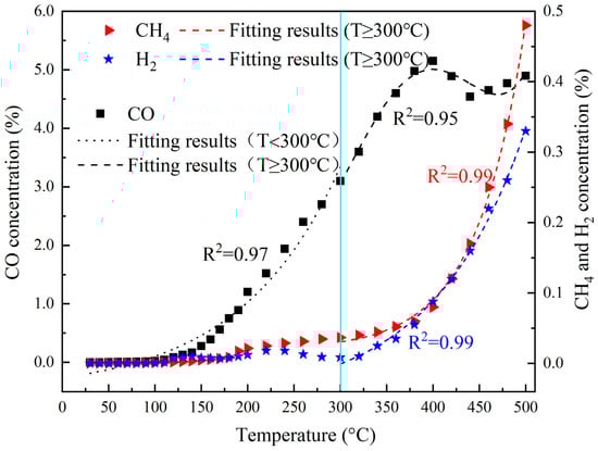 It is evident that the combustible gases produced during the coal self-ignition process primarily include CO, CH4, and H2. In the initial stages of coal self-ignition, the production of combustible gases is predominantly CO, and with the temperature of the coal rising to 300 °C, the release of CH4 and H2 significantly increases, with these stages primarily characterized by CH4, CO, and H2 as the main combustible gases. It indicates that the generation of combustible gases during coal self-ignition exhibits distinct segmental characteristics. The concentration and composition of these gases vary according to the different temperature stages of coal self-ignition. The concentration of combustible gases is segmented and fitted, as shown in Figure 4.