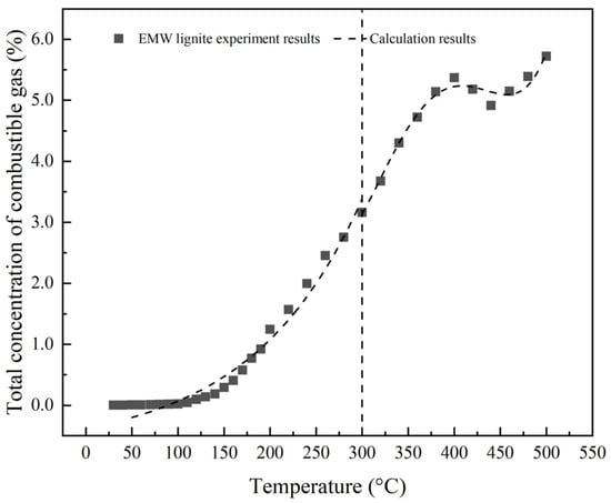 Comparison of experimental data and calculated results of the total concentration of combustible gas generated from EMW lignite.