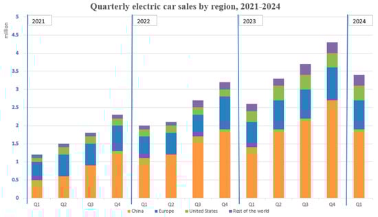 Electric car sales remained strong in the first quarter of 2024, surpassing those of the same period in 2023 by around 25% to reach more than 3 million (Figure 2). This growth rate was like the increase observed for the same period in 2023 compared to 2022. Most of the additional sales came from China, which sold about half a million more electric cars than over the same period in 2023. In relative terms, the most substantial growth was observed outside of the major EV markets, where sales increased by over 50%, suggesting that the transition to electromobility is picking up in an increasing number of countries worldwide [].