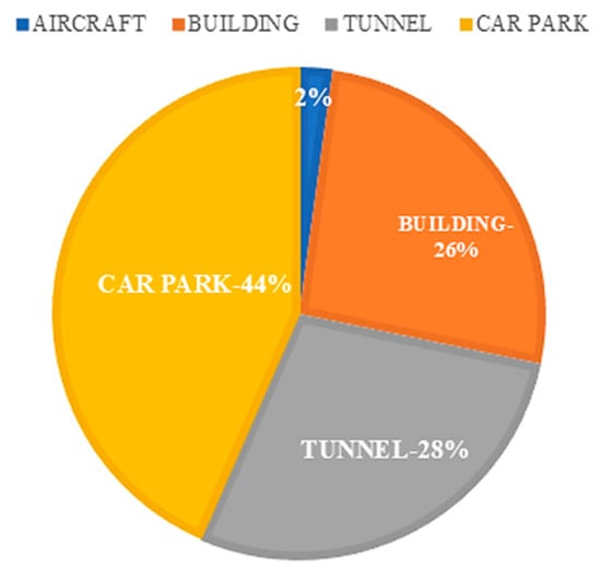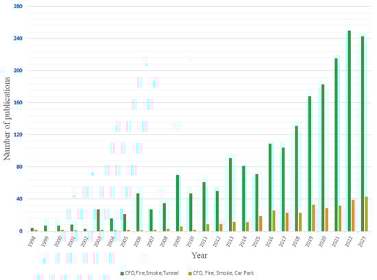 Figure 6 displays a comparison between studies containing the words CFD, fire, and smoke in various locations like tunneling and car parks. While both areas are important, the higher number of publications in the “CFD, Fire, Smoke, tunneling” category suggests a greater focus on understanding and mitigating risks in tunneling environments, reflecting their complexity, regulatory demands, and potential impact on safety and infrastructure. Conversely, the lower number of studies on car parks indicates a need for increased research to address specific challenges in this area, such as ventilation and fire safety in confined and multi-story car parks.