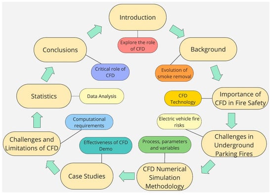 Computational Fluid Dynamics (CFD) is a valuable tool in enhancing fire safety, particularly in improving smoke exhaust efficiency in underground parking environments. CFD numerical simulations are increasingly used to assist in the design of smoke management systems in underground structures to ensure compliance with fire safety regulations []. By utilizing CFD numerical modeling, fire safety engineers can analyze and predict fire behavior, smoke propagation, and the effectiveness of ventilation systems in underground car parks [].