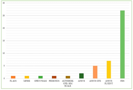 This rise underscores growing concerns and the intensified focus on improving fire safety measures, particularly in response to the evolving challenges posed by modern technologies and vehicle types, and this is proof that CFD has become increasingly prevalent in recent years. The red column from Figure 5 represents the number of scientific articles published on the same topics as the first column, but with the addition of electric vehicles, this shows that in recent years, electric vehicles became a significant research topic, but it still constitutes a smaller subset of the overall research in CFD, fire, numerical simulation, and smoke. However, the increasing trend in the red column suggests that the intersection of these topics with EVs is becoming more significant due to the growing importance of EVs in modern technology and the associated fire safety concerns.
