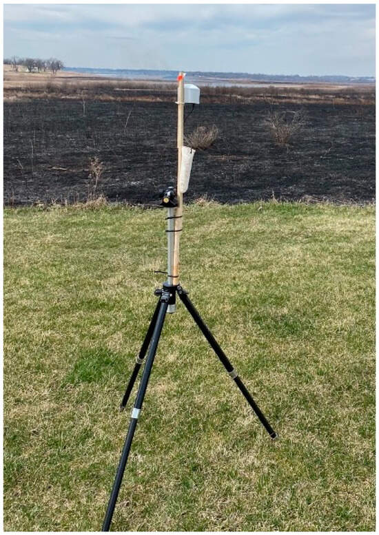PM2.5 concentration data were collected both upwind and downwind of the fires being measured. To collect the upwind concentration data, a PurpleAir sensor for PM2.5 was affixed to a tripod placed in an area that the person in charge of the burn, the burn boss, predicted to be upwind of the plot being burned. To collect the downwind data, a second identical tripod with a PurpleAir was set up near the initial point of ignition; since all burns were relatively flat, this was often the most downwind spot. The tripod setup can be seen in Figure 1. Before beginning the burn, all sensors were placed upwind together to confirm the two sensors produced consistent results. The design of the PurpleAir already includes two PM sensors per PurpleAir unit, so there were in effect four sensors. The duration of the co-location varied based on availability of burn staff; however, it was found that the PurpleAir sensors gave similar results in pre-burn conditions. Upon receiving the go from the burn boss, the downwind sensor(s) were relocated to their downwind spot with ignitions starting shortly after. The final locations were negotiated with the burn boss to ensure safe distances but also significant smoke exposure. Following the burn, the sensors were left to run for about 15 min before being unplugged. In addition to particulate matter, the PurpleAir also measured relative humidity (RH), air pressure, and air temperature.