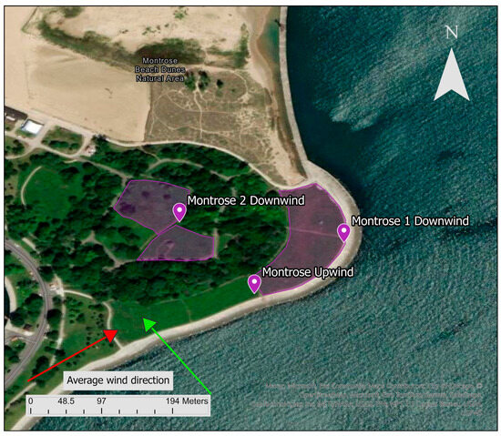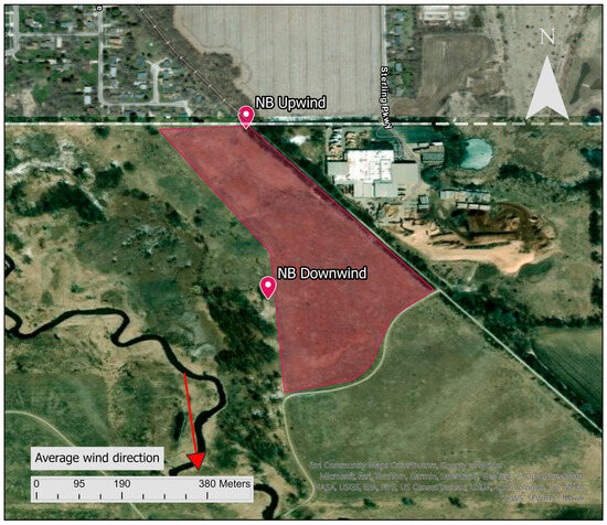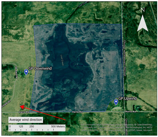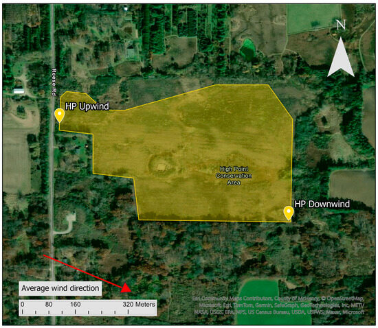 Hourly wind data were obtained for each burn date from the Western Regional Climate Center’s cli-MATE: MRCC Application Tools Environment [31]. Two U.S. National Weather Service surface weather stations were used: the Chicago Waukegan Regional Airport station (42.43° N, 87.86° W) was used for the McHenry County burns and the Chicago Midway Airport station (41.78° N, 87.76° W) was used for the Cook County burn. For the three sites in McHenry, the weather station was 40–60 km from the burn locations. For the Cook County burns, the distance was 23 km. These data were used to plot wind vectors, as well as generate a wind rose for the duration of each measurement period, since no local wind data were available. Using the burn area maps, sensor placement vectors pointing from upwind to downwind were also generated and plotted on the wind rose for comparison.