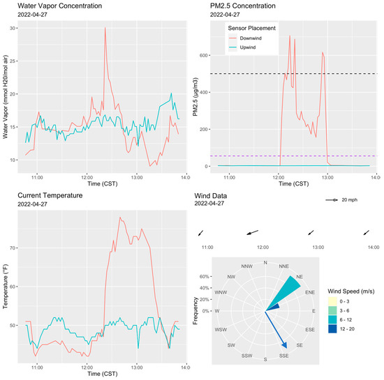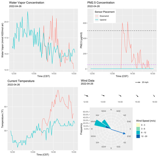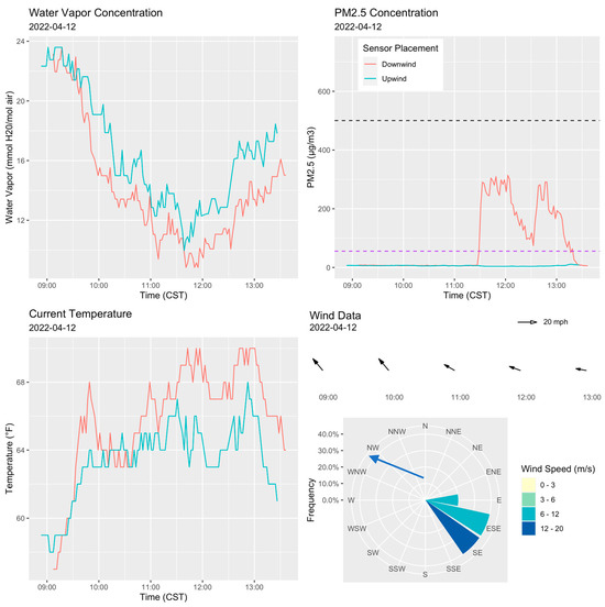 Figure 6, Figure 7, Figure 8 and Figure 9 show the water vapor concentration, corrected PM2.5 particle concentration with dashed lines at the 151 AQI and 500AQI particulate mass equivalent, temperature, and wind vectors, as well as wind roses, for each of the four burns. Looking at the four days, a relationship between water vapor concentration, temperature, and PM2.5 concentration is present. Excluding the 12 April burn due to sensor noise, the figures all show spikes in the downwind sensors at similar times, indicating that the sensors were directly in the smoke plume. This highlights the relationship between fire behavior and the temperature and humidity in the immediately surrounding area. Air temperature increases up to 20 °C and water vapor concentration increases up to 10 mmol H2O/mol air for some burns. Both measurements have potential for scaling PM2.5 emissions, but a larger dataset would be necessary.