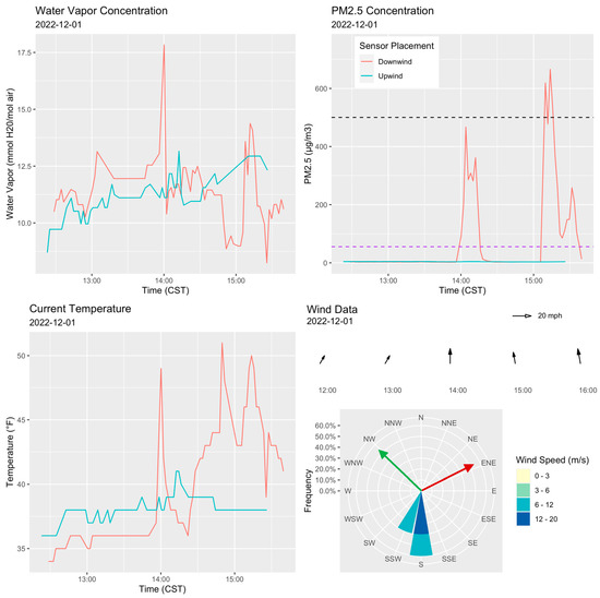 Water vapor concentration, PM2.5 particle concentration with dashed lines at 151 AQI (purple) and 500AQI (black) mass equivalent, temperature, and wind vectors and rose with blue sensor placement vector pointing from upwind to downwind for the 1 December Montrose Bird Sanctuary burn. The lakeside burn is to the left of the blue line and the red sensor vector. The interior burn is on the right side of the blue line and the green sensor vector.
