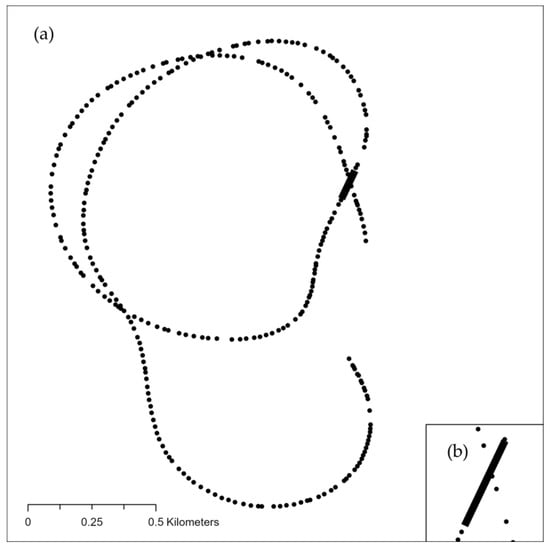 (a) Representation of flight paths derived from ADS-B data points, with the ATU drop path marked by a black line. (b) Enlarged view illustrating the congruence of ADS-B and ATU data points, demonstrating data consistency.