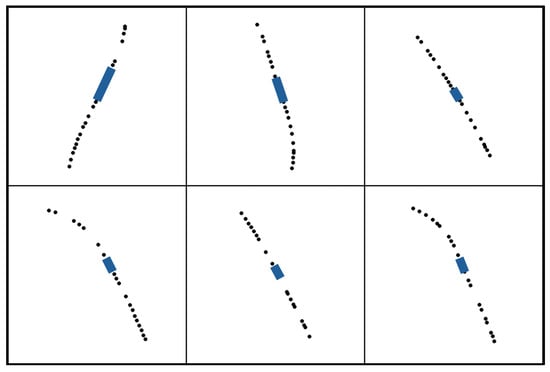 This figure compares two different data sources used in this study: flight trajectory points captured by ADS-B data, and ATU drop data within a 30 s window. Each panel illustrates a unique suppressant release event, showing flight paths marked by points at one-second intervals and suppressant release locations measured using the onboard ATU instrument, denoted by a solid blue rectangle. This figure demonstrates the spatial alignment between the two data sources used in the modeling process.