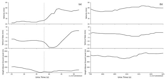 Comparative visualization of aircraft flight parameters during firefighting operations. (a) Represents a time series during an active suppressant drop event, highlighting the aircraft’s velocity, vertical rate, and height above ground level. The dotted vertical line in (a) marks the timestamp of the start of the suppressant release, illustrated by a significant change in vertical rate and AGL, which is not present in (b). (b) Depicts a similar time series where no drop events occur, displaying steadier flight parameters throughout the observed period. These graphs provide a distinction between the aircraft’s flight behavior during drop and non-drop sequences and visually show data with continuous coverage.
