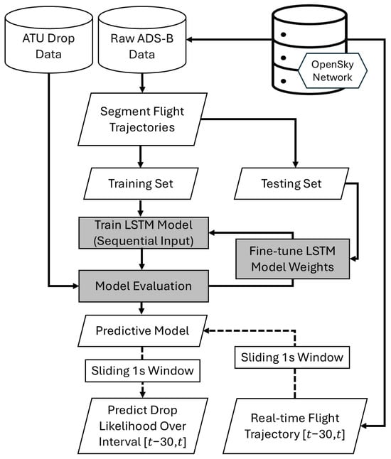 A flowchart depicting the workflow of integrating ATU and ADS-B data, segmenting flight trajectories, training the LSTM model, and generating suppressant drop predictions.