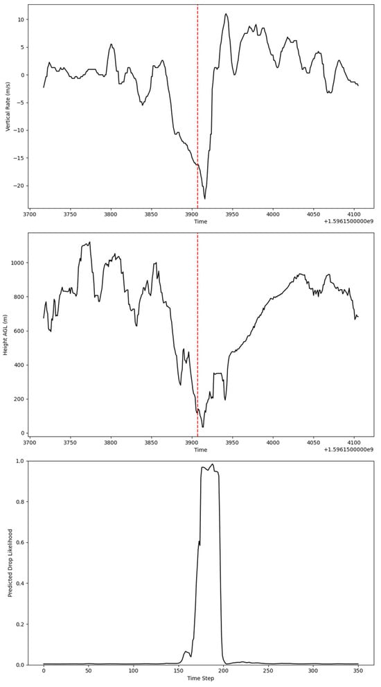 Visualization of LSTM model predictions for a fixed-wing aerial suppressant drop across time (Unix). The vertical red line indicates the start of the suppressant drop. The first two subplots depict the input covariates: vertical rate (m/s) and height AGL (m) over time. The input covariates were unseen during the model training. The third subplot illustrates the predicted drop likelihood over time.